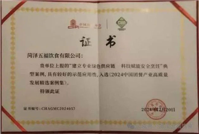 多年來,公司載譽無數(shù),先后榮獲“2016年度山東省集體配餐優(yōu)秀單位”、“2017年度中國團餐優(yōu)秀企業(yè)”、“全國企業(yè)信用評價AAA級信用企業(yè)”、“2017年度山東團餐優(yōu)秀企業(yè)”、“2018年度山東團餐十大優(yōu)秀管理企業(yè)”、“2019年度山東團餐品牌二十強”、“2021年度山東團餐品牌二十強”、“2021年度山東團餐食育先行單位”、“2021年度中國團餐服務(wù)質(zhì)量優(yōu)秀企業(yè)”、“2022年度中國團餐企業(yè)TOP100”、“2022年度團餐領(lǐng)跑者TOP300”、“2022年度山東團餐品牌TOP20”、“2022年度中國校園餐服務(wù)質(zhì)量百強企業(yè)”、“2023年度山東團餐鄉(xiāng)村振興樣板企業(yè)”、“山東知名品牌”、“2023年餐飲企業(yè)示范單位”、“2023年度團餐領(lǐng)跑者”、“曹縣2023年度放心消費示范單位”、“2024年度山東省食育工作先行單位”“山東省食育工作服務(wù)站”、“2024團餐服務(wù)百強企業(yè)”、“2024年度山東團餐質(zhì)量發(fā)展企業(yè)”、“2024年度團餐企業(yè)領(lǐng)跑者TOP300”等榮譽稱號。這些榮譽不僅是對公司過往成績的肯定,更是激勵公司不斷前進、持續(xù)提升服務(wù)品質(zhì)的動力源泉。